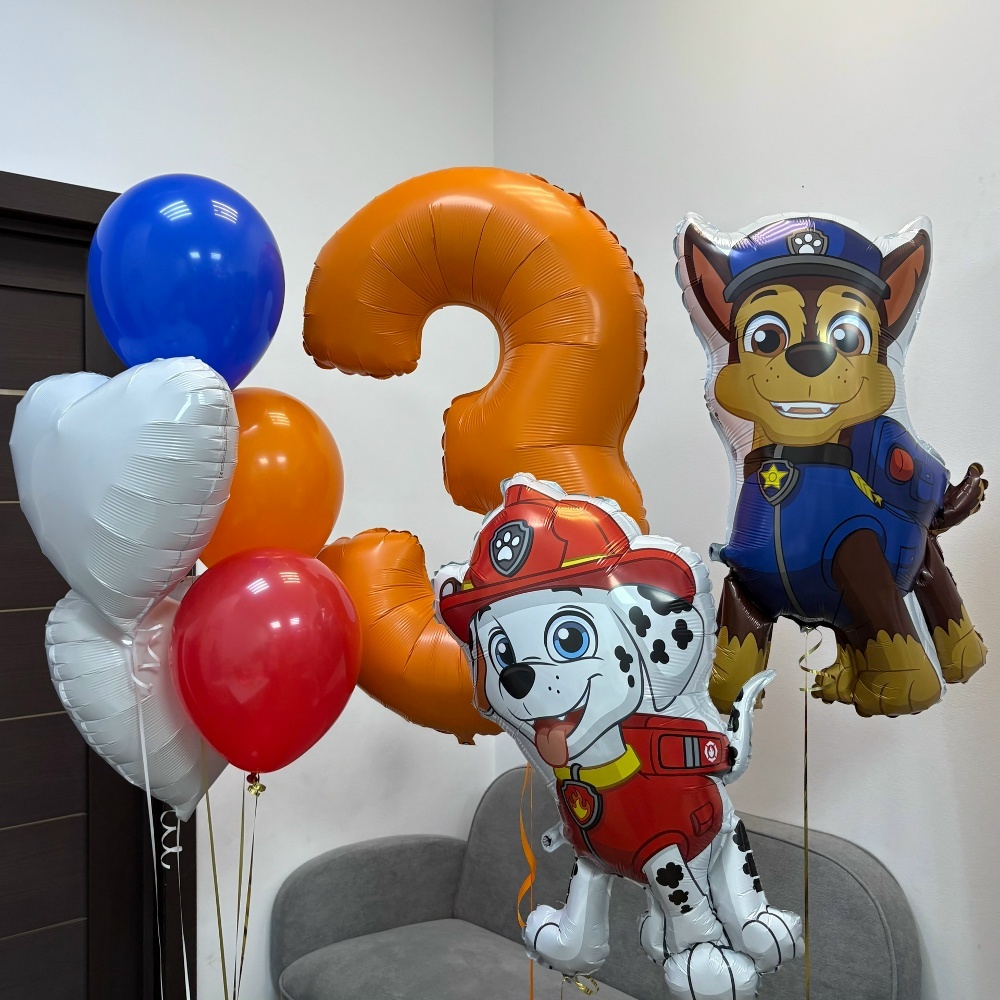 Связка: 3 цветных шара 2 сердца Цифра( на выбор) Фигура чейз Фигура маршал