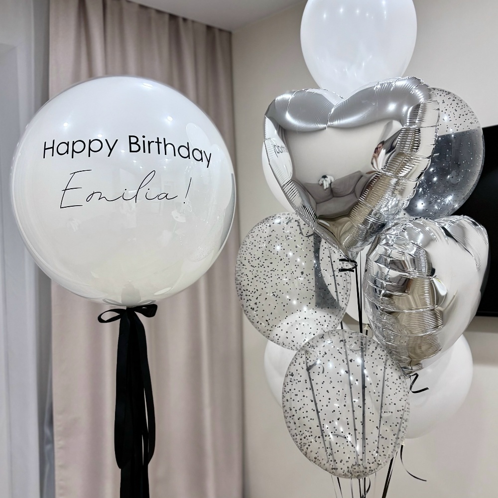 Связка: 5 белых Шаров 3 шара с конфетти 2 сердца Большой зеркальный шар с надписью