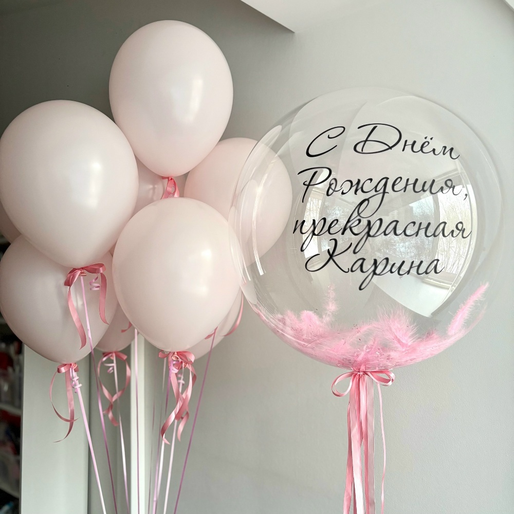 10 Шаров розовых с бантиками внизу (в потолок) Баблс с перьями и надписью