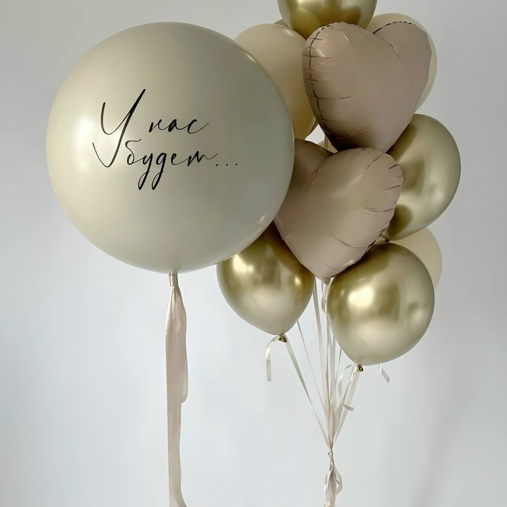 Связка: На атласных лентах 5 бежевых Шаров 5 золотых Шаров 2 сердца кремовых Гендерный шар бежевый