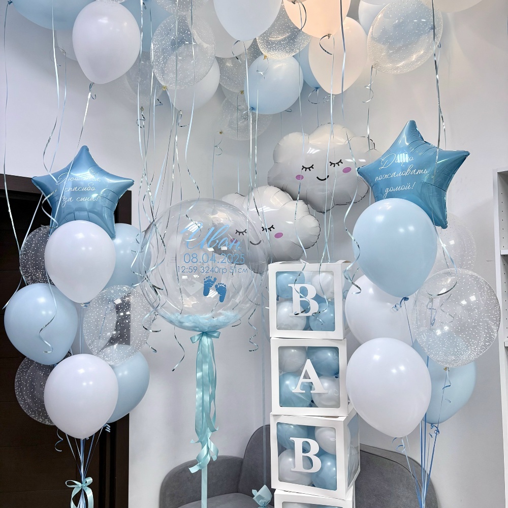 2 голубых шара, 2 белых шара, 2 шара с конфетти, звезда с надписью