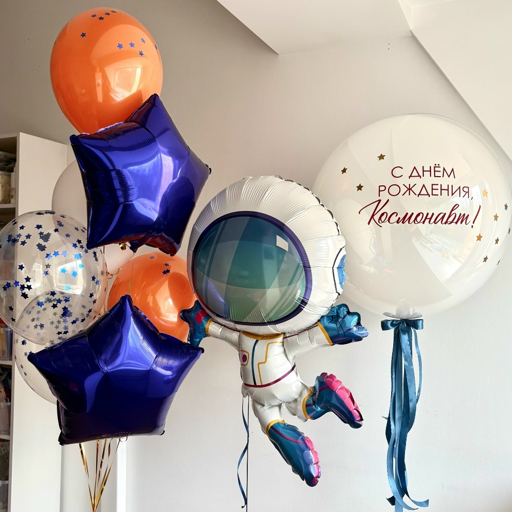 Связка: 2 двойных оранжевых шара с конфетти, 2 шара с конфетти, 1 белый шар , 2 звезды синие Большой зеркальный шар с надписью Фигура космонавт
