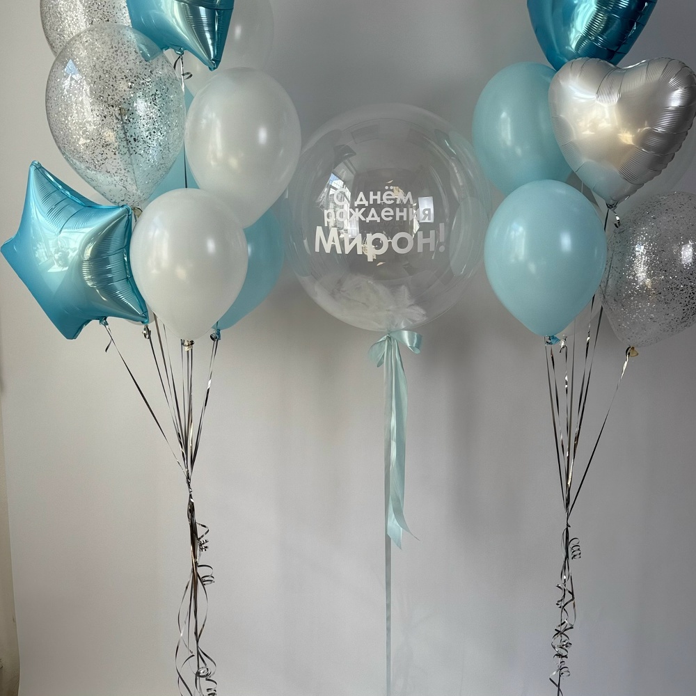 2 белых шара, 2 голубых шара, 1 шар с конфетти, 1 звезда, 1 сердце