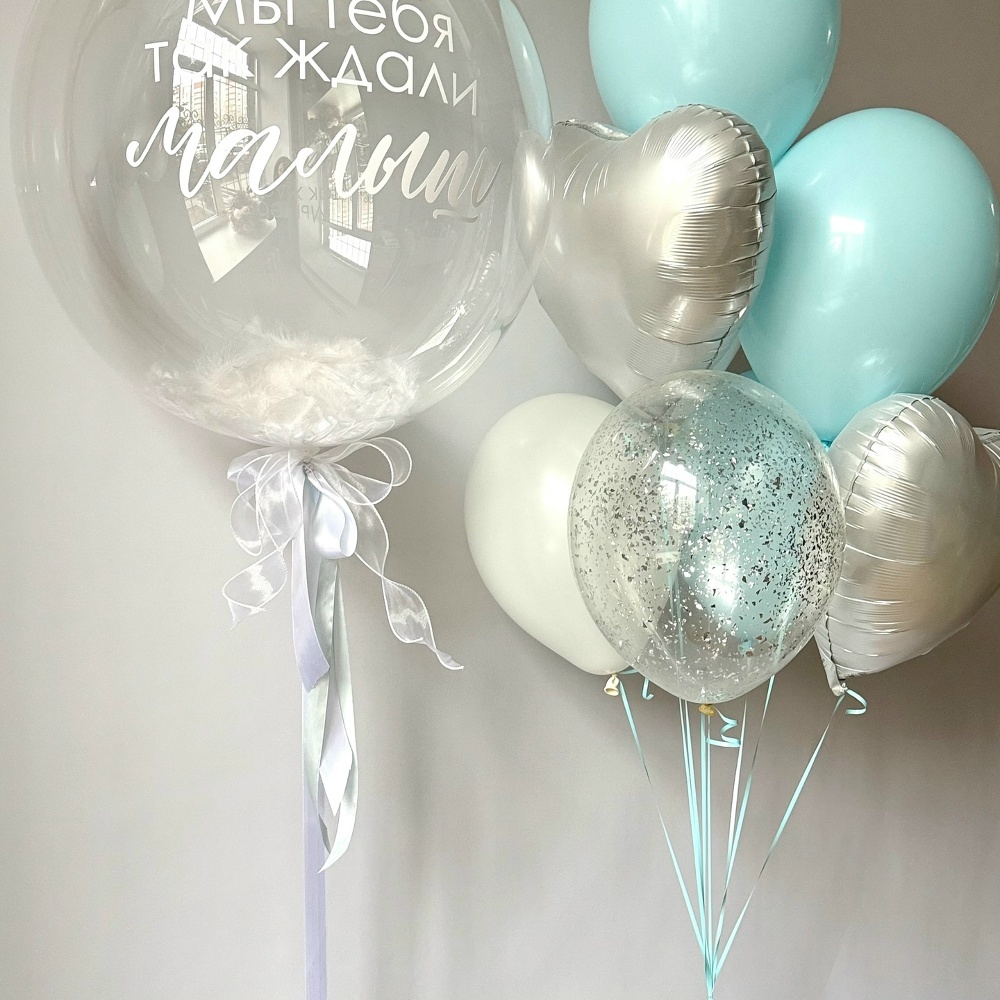 Связка: 3 голубых шара, 1 белый шар, 1 шар с конфетти, 2 сердца Баблс шар с перьями и надписью