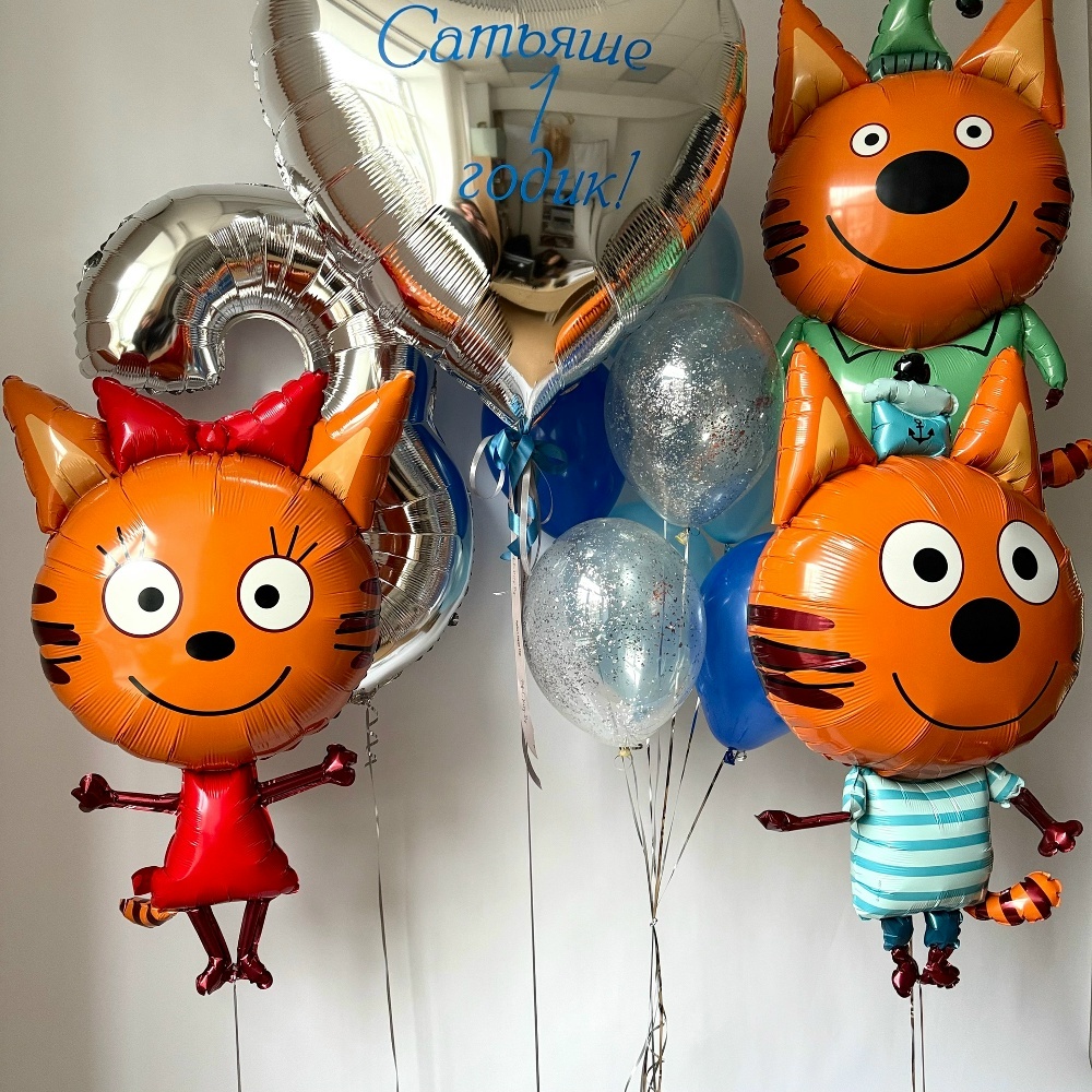 Связка: 3 перламутровых голубых шара, 2 шара с конфетти, 2 синих шара Сердце (90см) с надписью Цифра (на выбор) Фигуры 3 кота