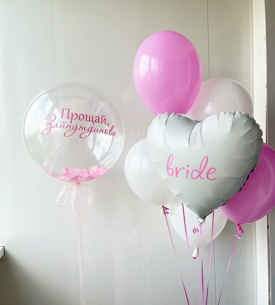 Связка: 3 белых шара, 3 фуксия шара, 1 сердце с надписью Баблс с перьями и надписью