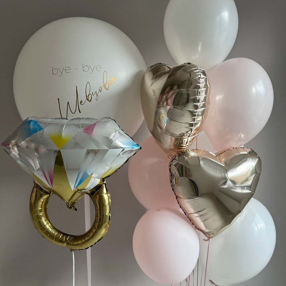 Связка: 4 розовых шара 4 белых шара 2 сердца шампань Кольцо фигура Большой шар с новой фамилией внутри