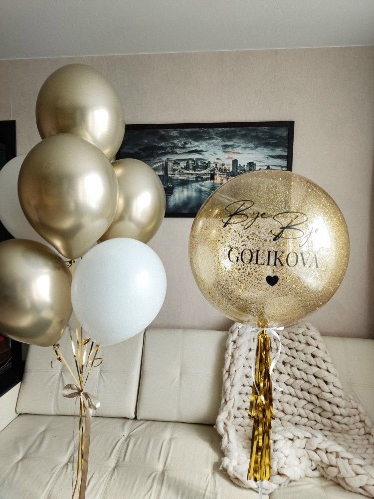 Связка: 4 золотых шара 3 белых шара Баблс с конфетти и надписью ( с пушистой золотой кисточкой)