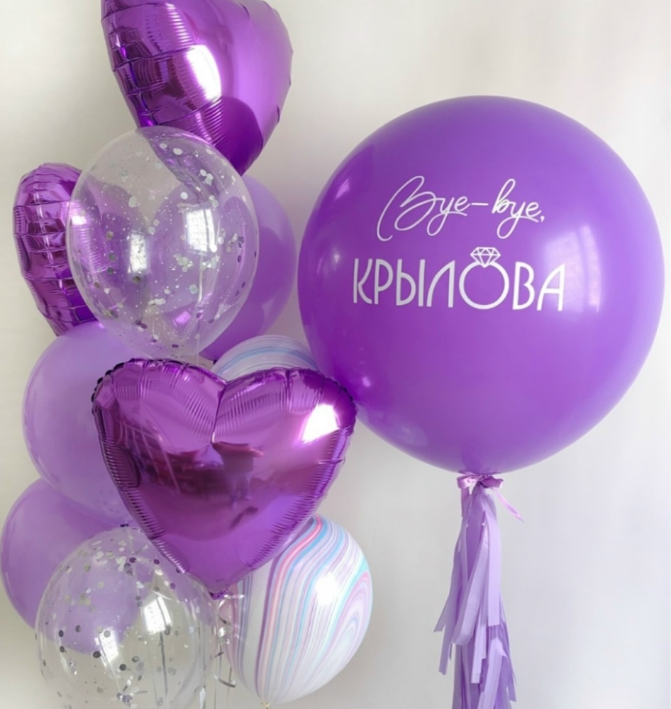 Связка: 4 сиреневых шара 3 шара с конфетти, 2 Агата ( с разводами) 3 сердца Большой шар на девичник с новой фамилией внутри и пушистым хвостом