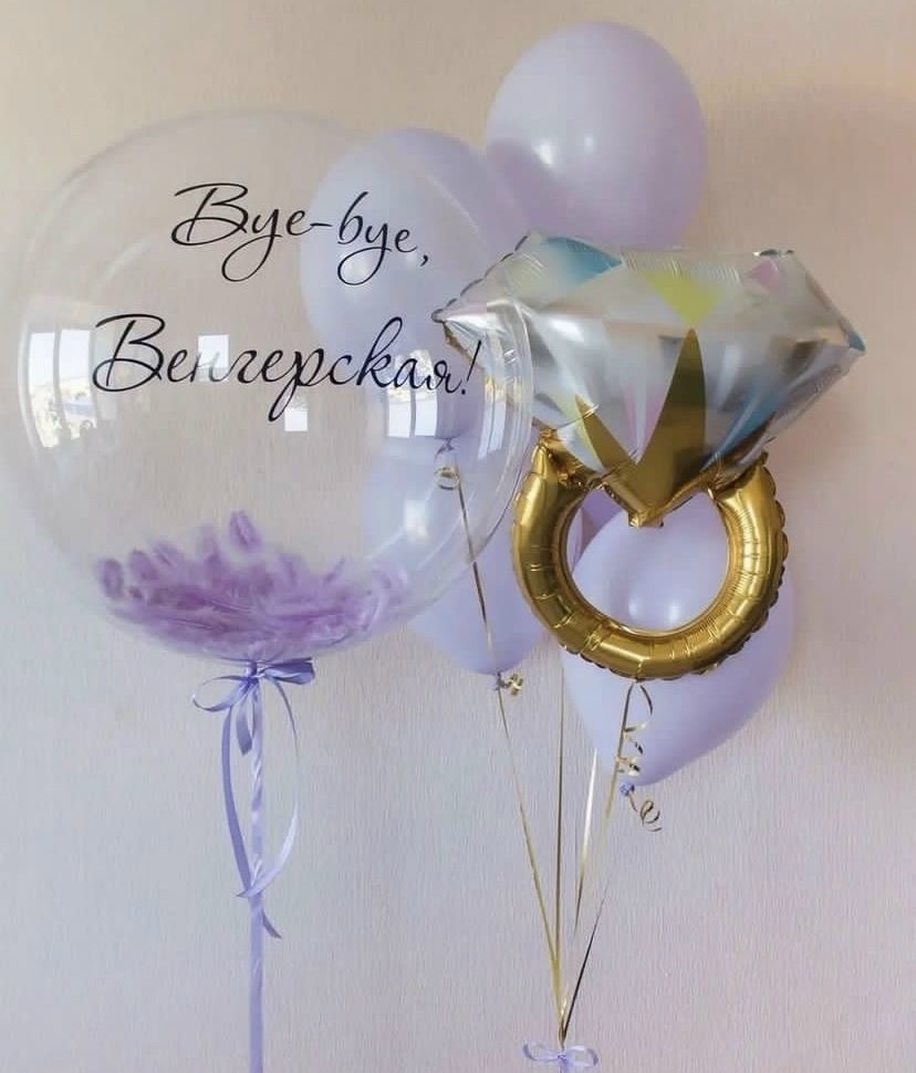 Связка: 5 сиреневых Шаров, фигура кольцо Баблс с перьями и надписью (любой)