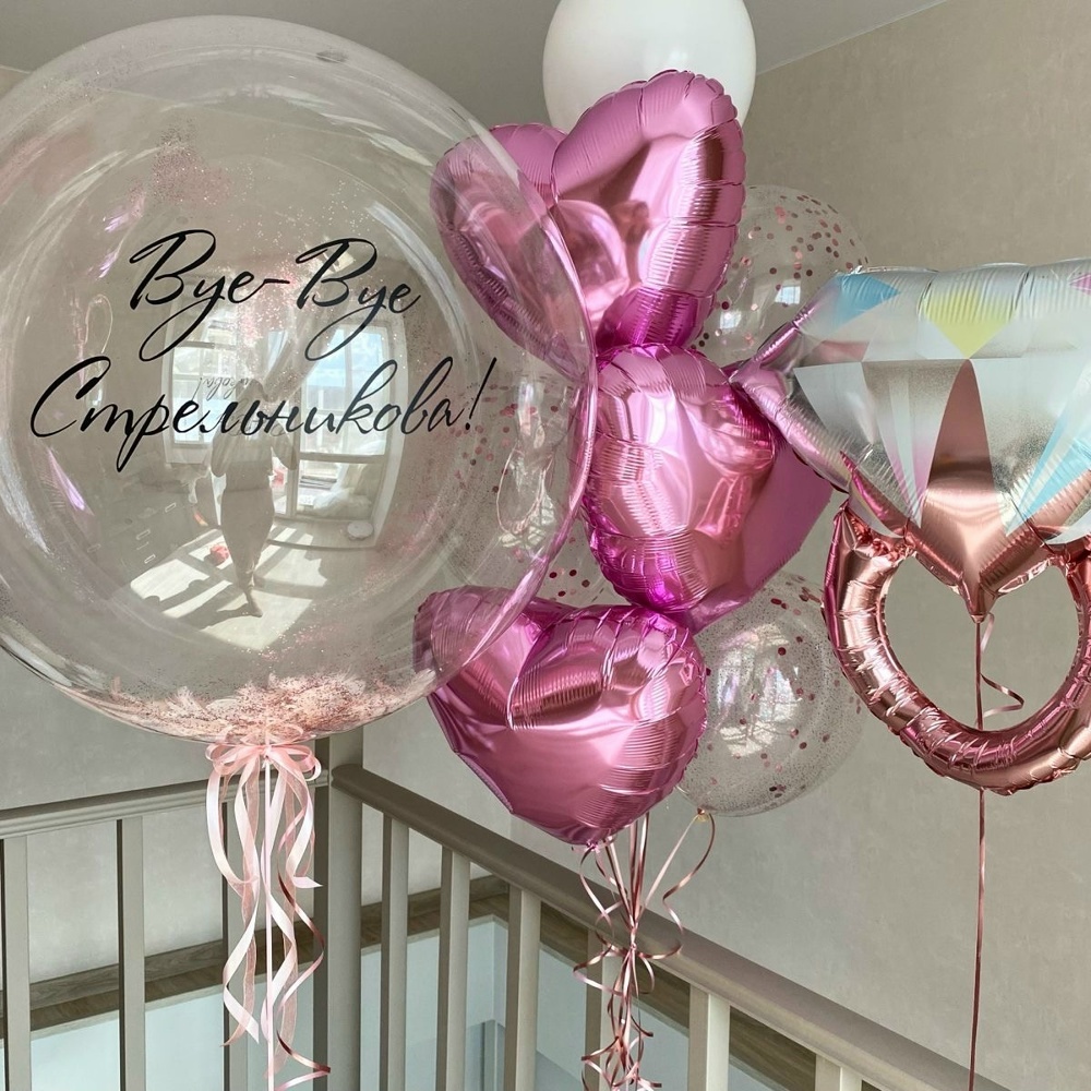 Связка: 4 белых шара, 3 шара с конфетти 3 сердца Фигура кольцо Баблс шар с перьями и надписью (любой)
