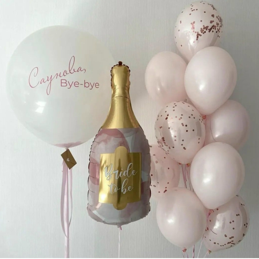 Связка: 8 розовых Шаров 5 двойных Шаров с конфетти Большой шар на девичник с новой фамилией внутри Фигура шампанского