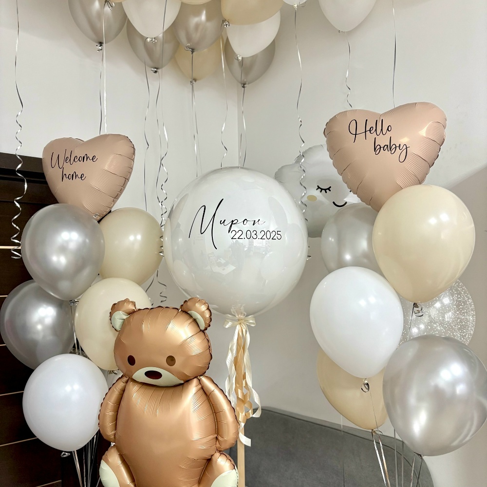 2 бежевых шара,2 белых шара, 3 серебро шара, 2 с конфетти шара, 1 серде с надписью