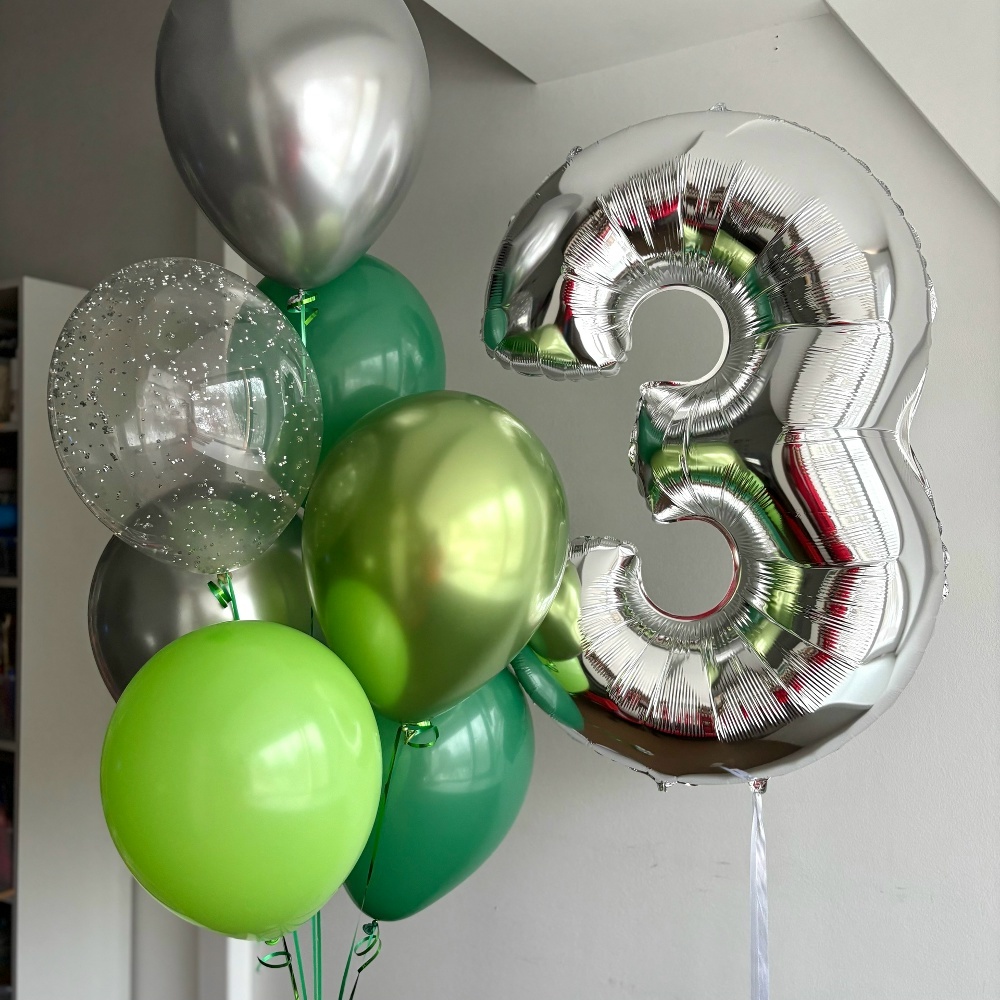 Связка: 2 зеленых шара,1 светло зеленый шар, 2 хром серебро шара, 1 шар с конфетти Цифра ( на выбор)