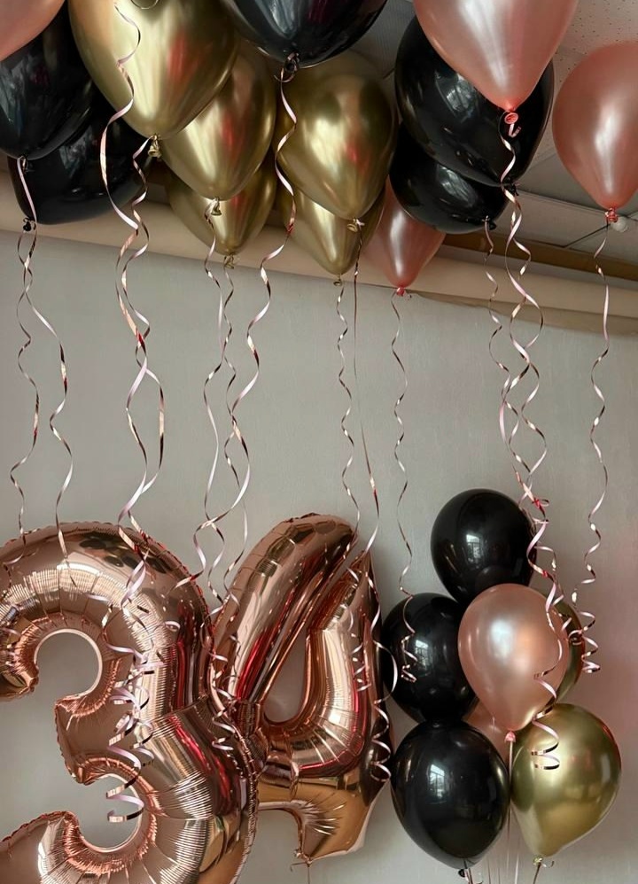 В потолок: 6 черных Шаров, 5 золотых Шаров, 4 перламутр розовое золото шара 2 цифры (на выбор) Связка: 3 черных шара, 2 золотых шара, 2 шара перламутр розовое золото