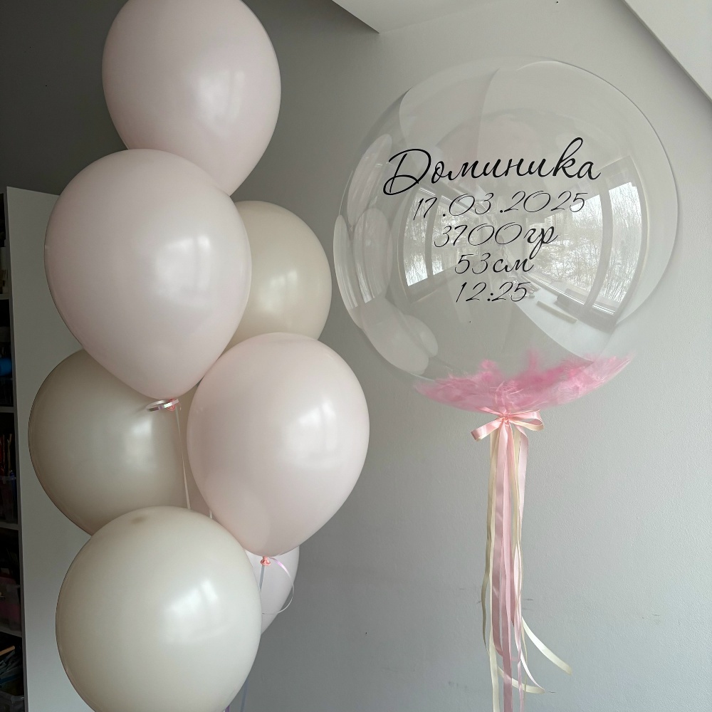 Связка: 4 нежно розовых шара, 3 бежевых шара Баблс шар с перьями и набписью