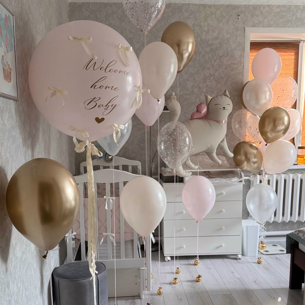 2 розовых шара, 2 бежевых шара, 3 золотых шара, 2 шара с конфетти, 2 шара перламутр белый