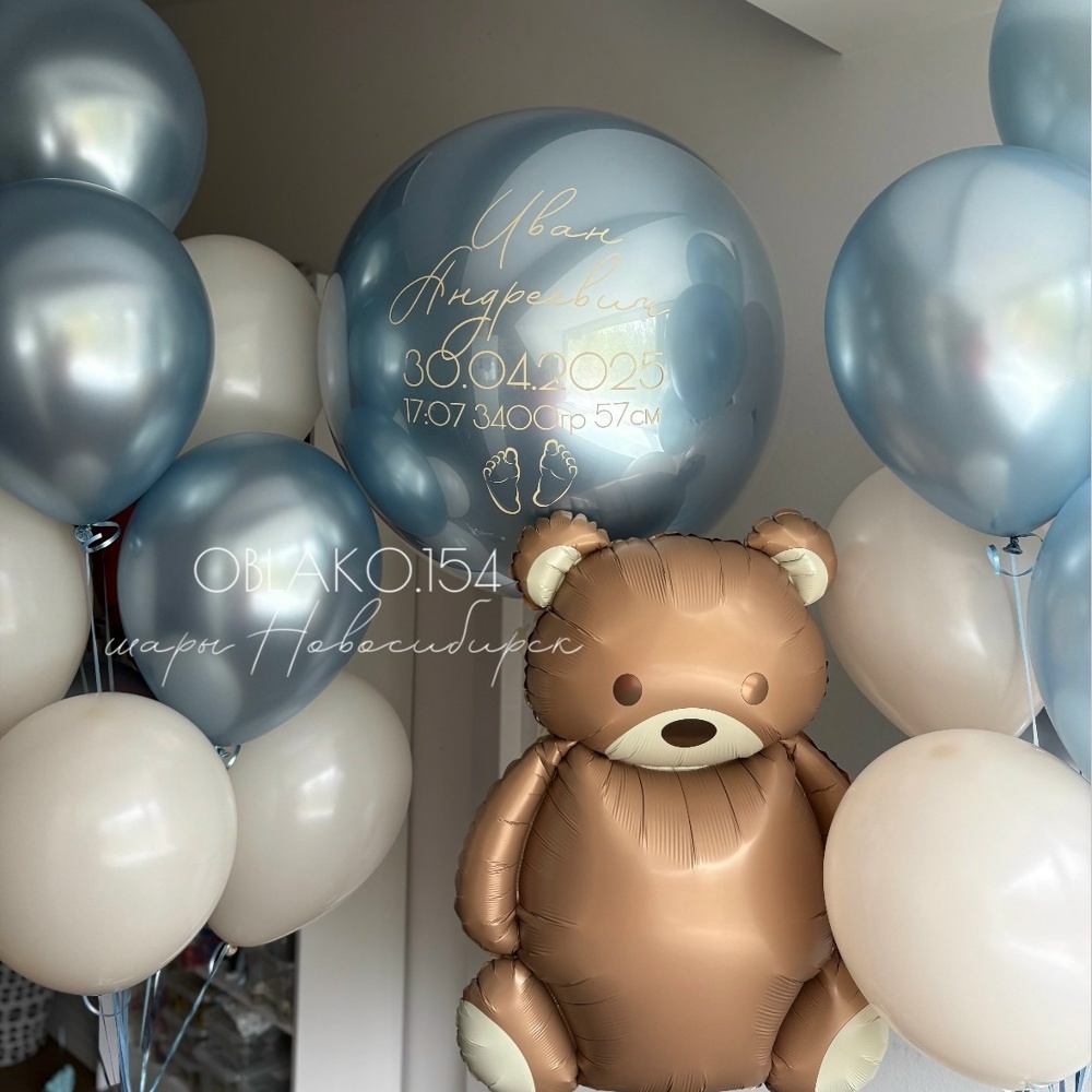 2 связки по: 4 шелк голубых шара 4 кремовых шара 2 сердца коричневых Большой шар гигант зеркальный шелк с надписью Мишка Барни