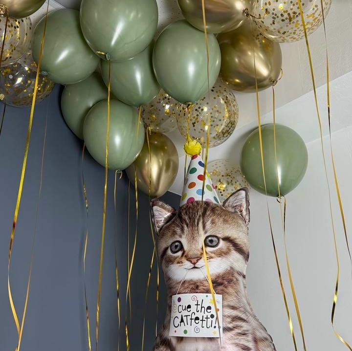 в потолок: 7 шаров эвкалипт, 7 золотых шаров, 7 шаров с конфетти фигура котика