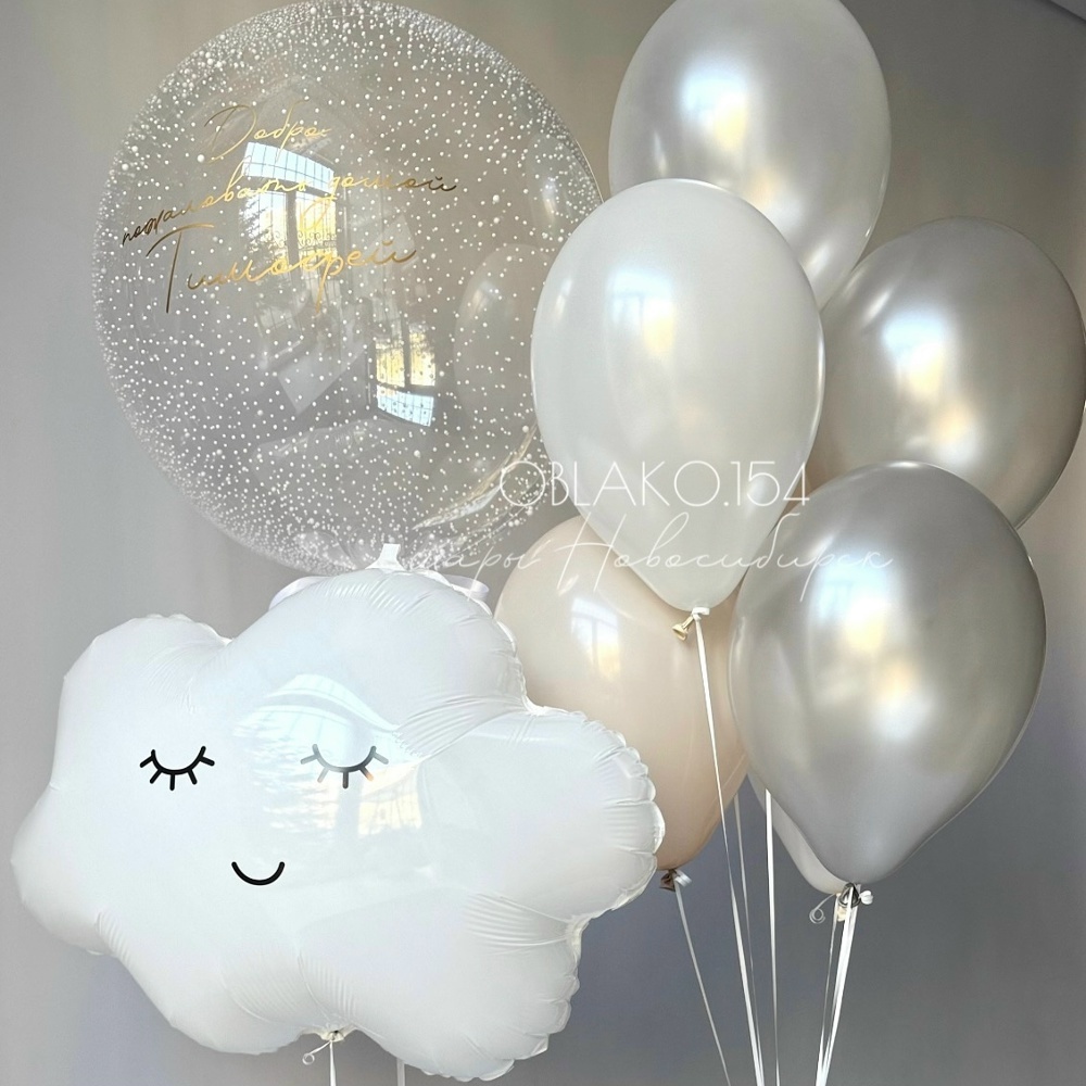 Связка: 2 белых шара 2 кремовых шара 3 шара перламутр серебро Баблс с пенопластом и надписью Фигура облако
