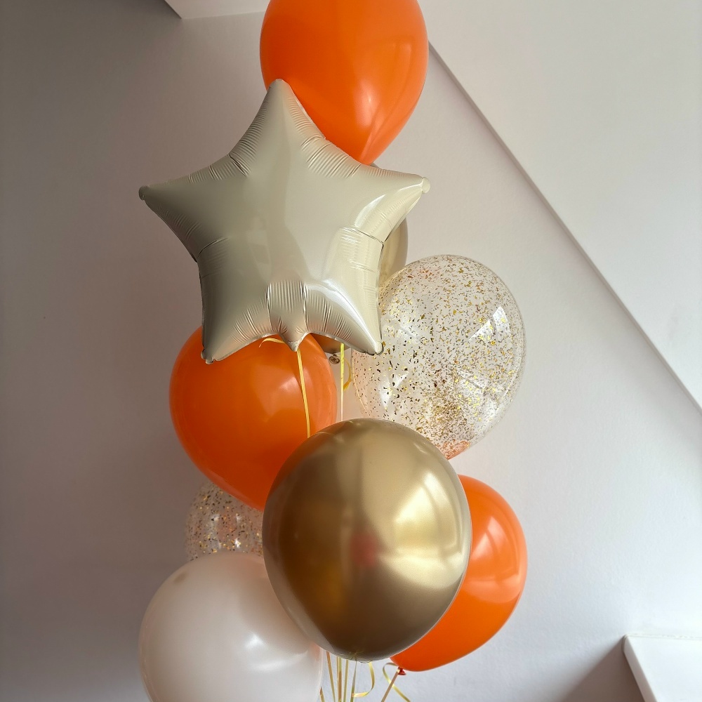 Связка: 3 оранжевых шара 2 кремовых шара 2 золотых шара 2 шара с конфетти 1 звезда