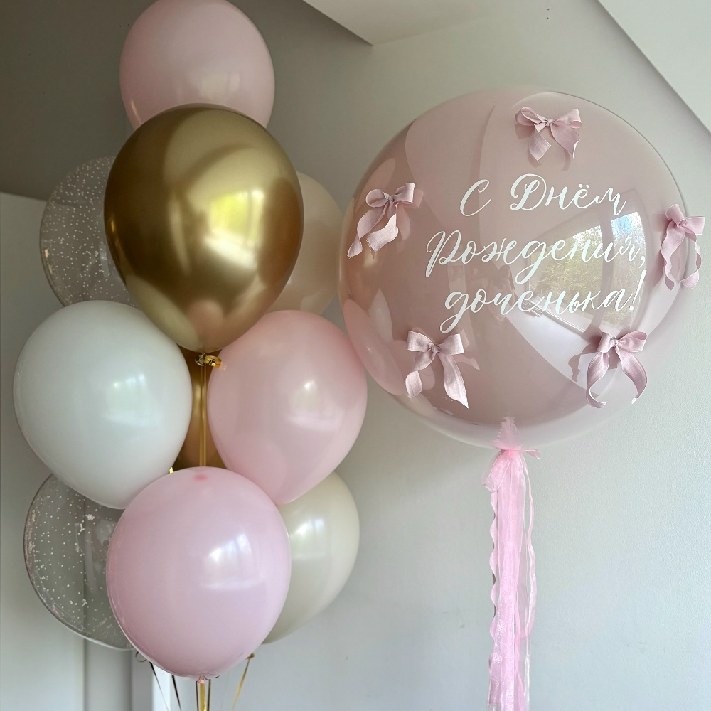Связка: 3 розовых шара 2 бежевых шара 1 белый шар 2 золотых шара 2 шара с конфетти Большой зеркальный шар с надписью и бантиками из волнистой ленты