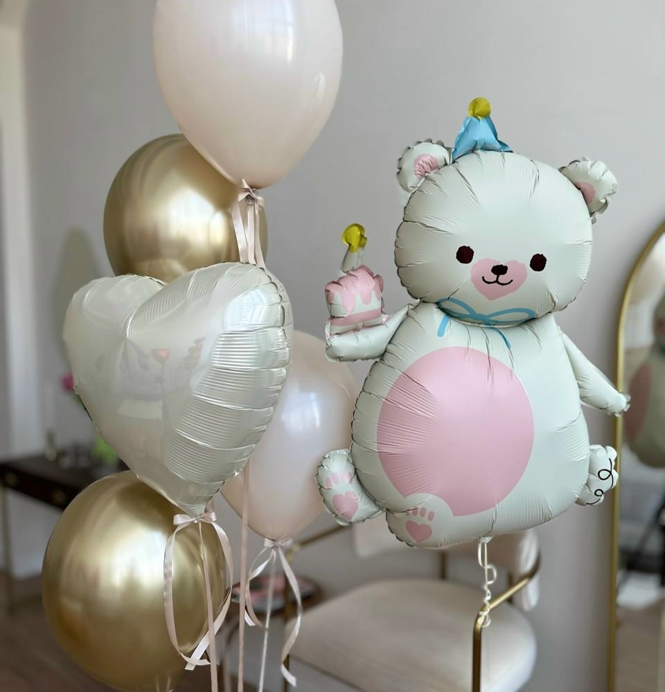 Связка из: 2 Шаров пыльная Роза с бантиком внизу 2 золотых Шаров с бантиком внизу 1 сердца с бантиком внизу Фигура мишки