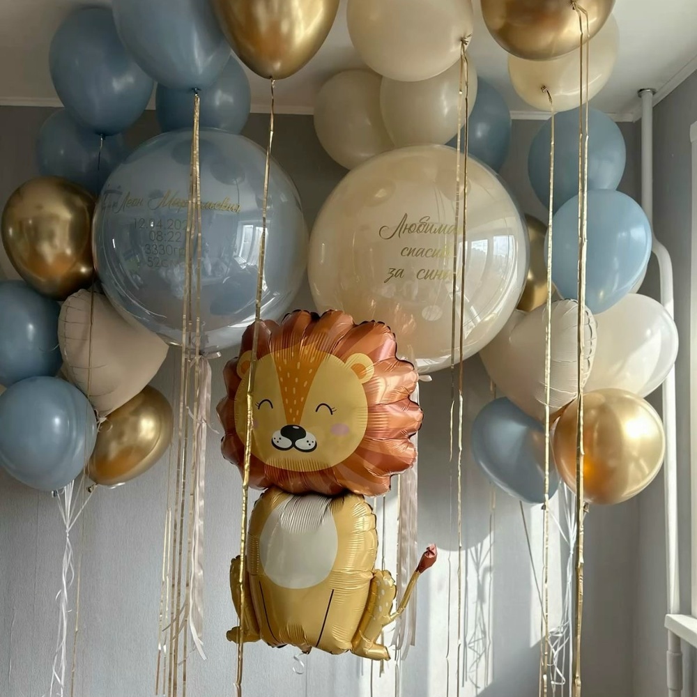 2 связки: 4 пыльно голубых шара 3 бежевых шара 2 золотых шара 1 сердце бежевое Гигант стеклянный бежевый с надписью Гигант стеклянный пыльно голубой с надписью Фигура Льва В потолок на дождике: 4 шара пыльно голубых<