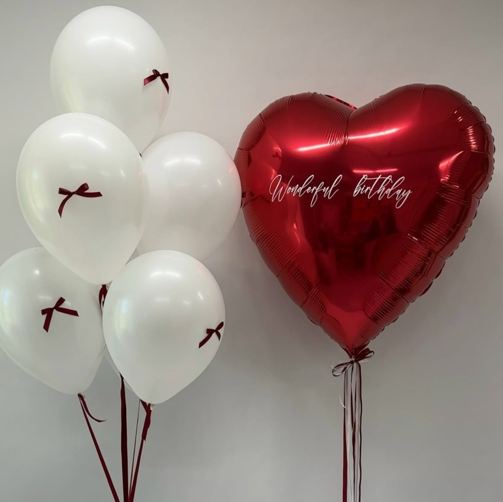 Связка из 7 Шаров с бантиком Большое сердце с надписью