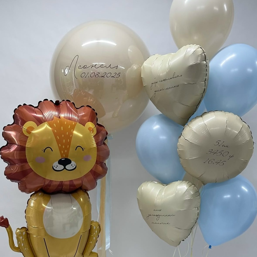 Связка из: 5 голубых Шаров 2 бежевых Шаров 2 сердца с надписью 1 круг с надписью Фигура Льва Большой зеркальный шар с надписью