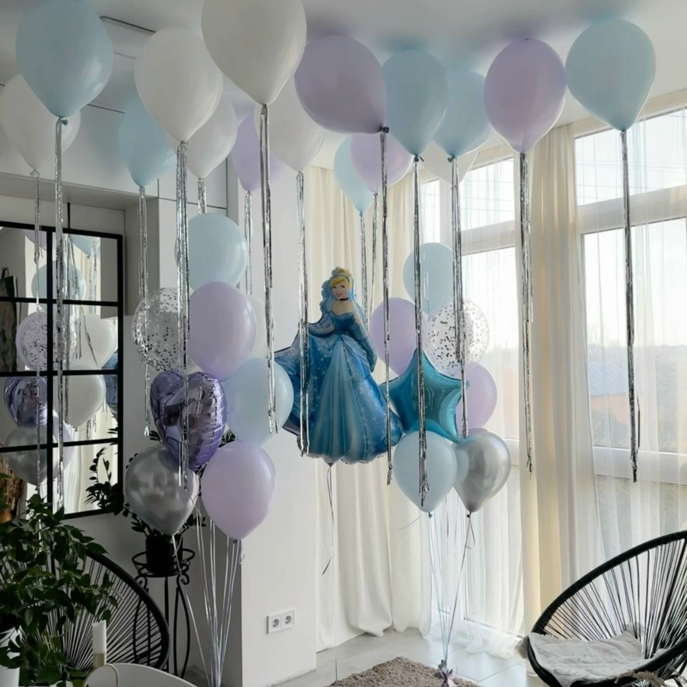 2 связки: 7 однотонных Шаров 1 шар с конфетти 1 шар серебро 1 сердце или звезда 15 Шаров в потолок на дождике Фигура принцессы