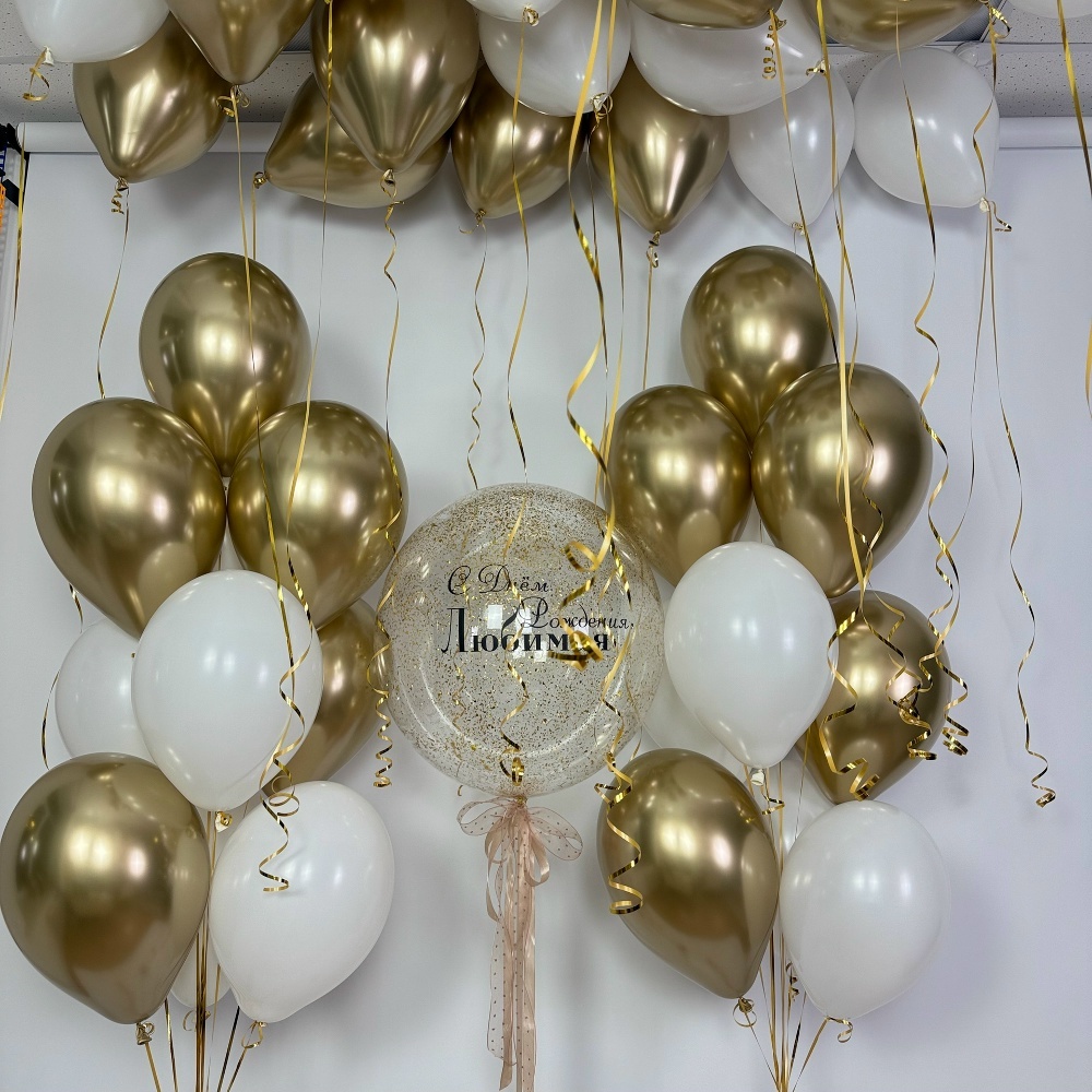 В потолок: 10 золотых Шаров 10 белых Шаров 2 связки по: 5 золотых Шаров 5 белых Шаров Баблс с конфетти и надписью