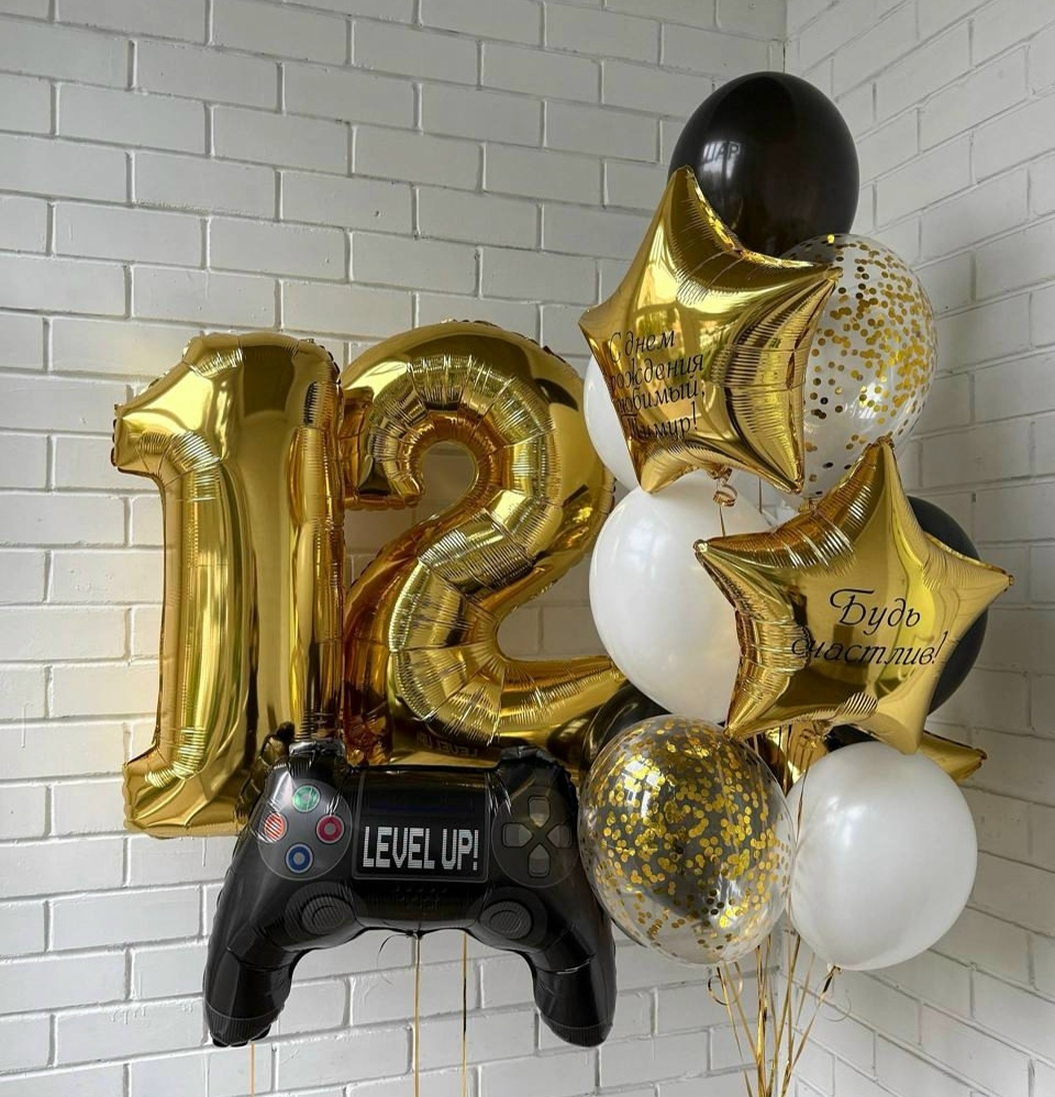 Связка: 4 белых шара 3 черных шара 3 шара с конфетти 3 звезды ( на 2 надпись) 2 цифры (на выбор) Фигура джойстик