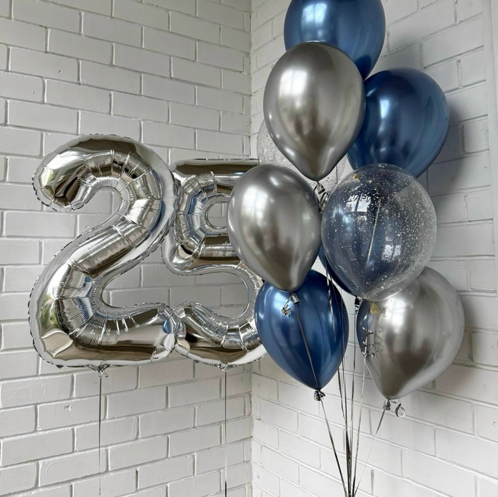 Связка 4 хром синих шара 3 хром серебро шара 2 шара с конфетти 2 Цифры (на выбор)