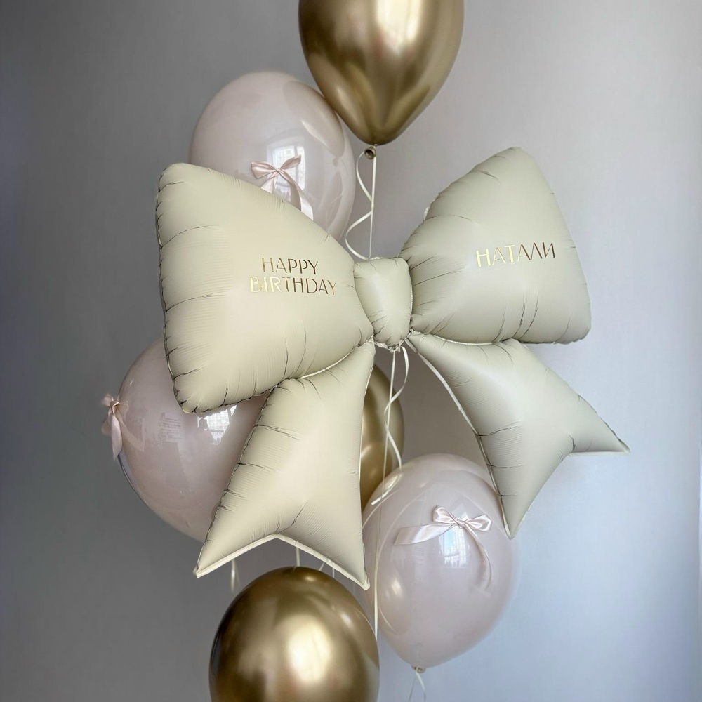 Связка из: 3 зеркальных шара с бантиком 3 хром шара 1 фигура бант с надписью