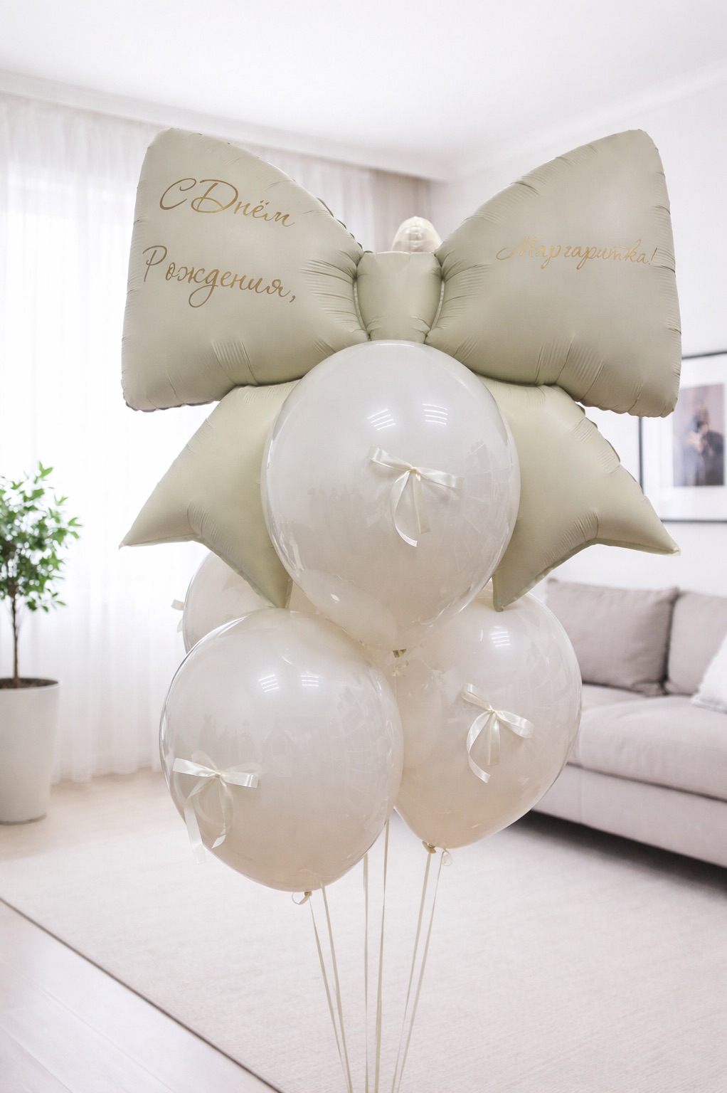 5 зеркальных кремовых шаров с бантиком, фигура бант с надписью