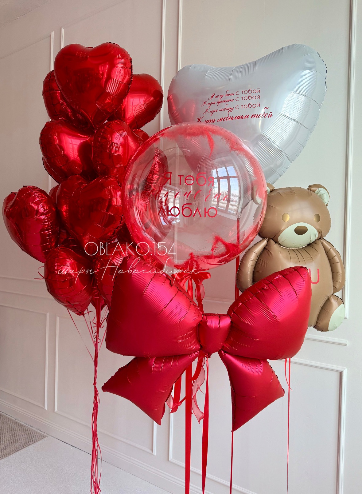 Связка из 15 сердец, большое сердце с надписью, баблс с перьями и надписью, мишка, бант