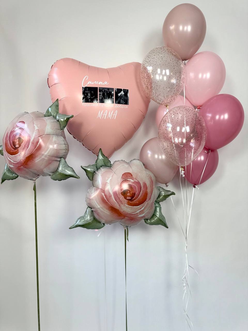Связка из 8 Шаров, большое сердце с фото, 2 фигуры роз