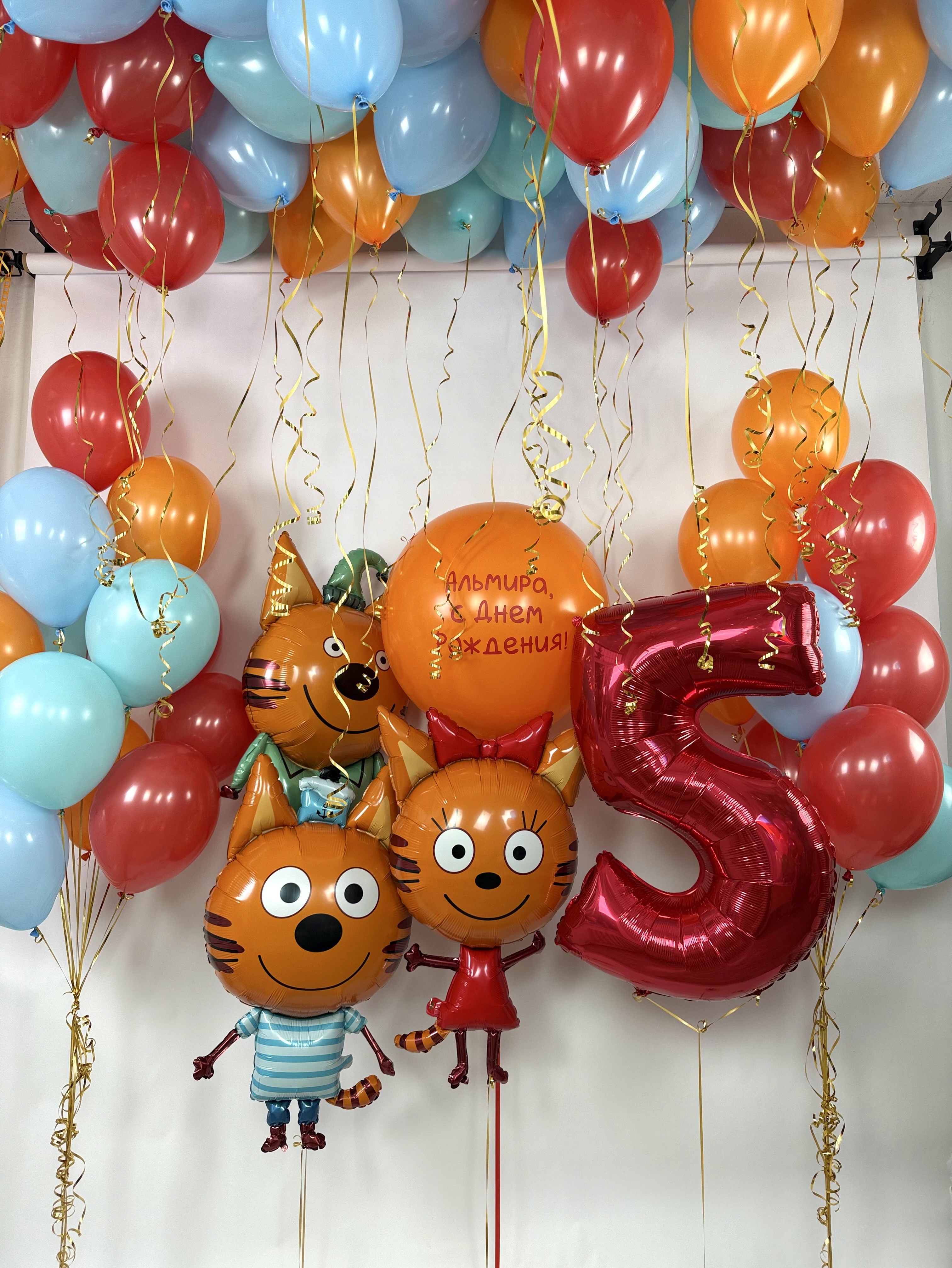50 Шаров в потолок, 2 связки по 11 Шаров, шар гигант с надписью, 3 фигуры котов, цифра(на выбор)