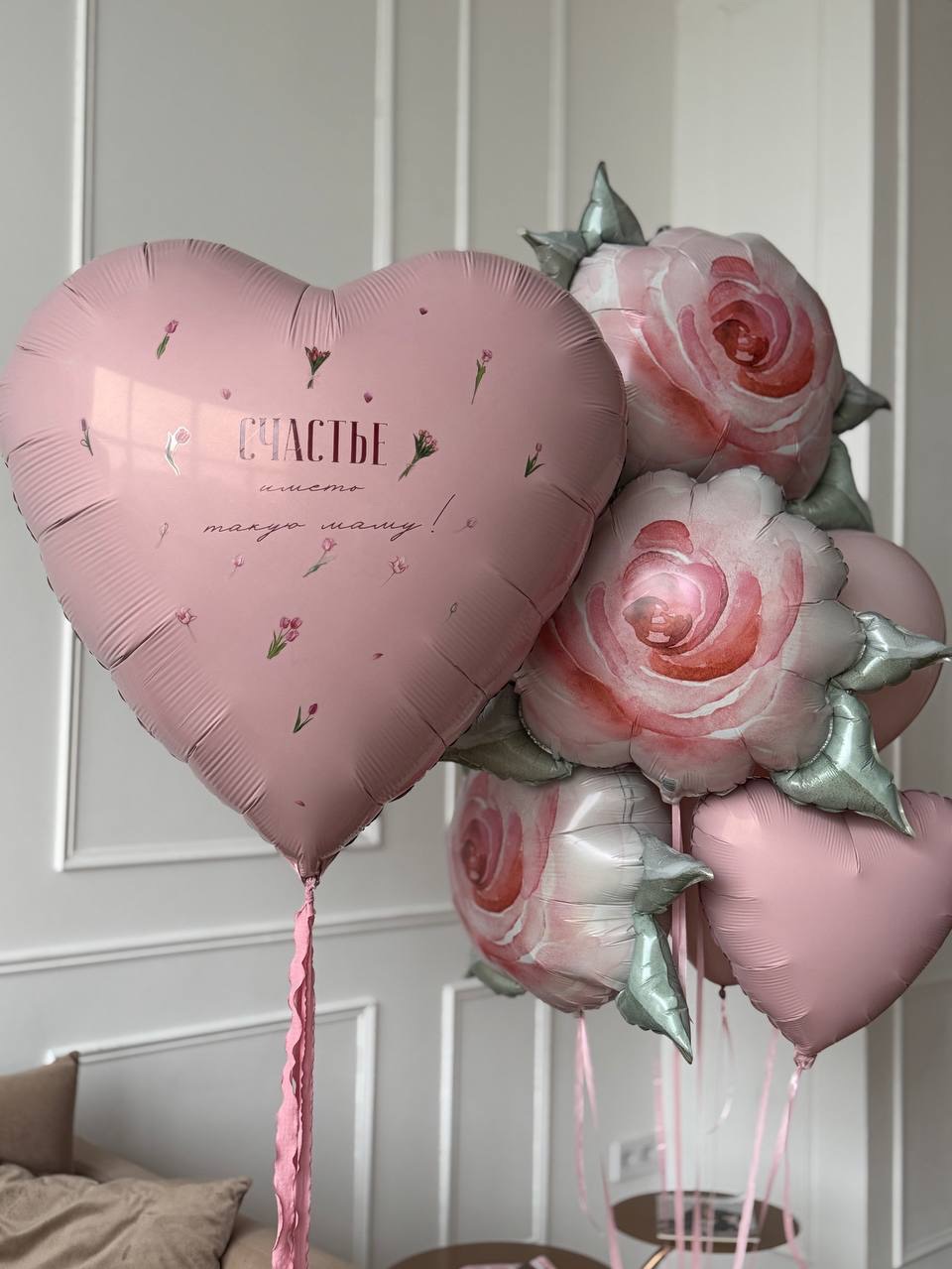 Связка: 3 розы, 2 сердца, 2 латексных шара. Юольшое сердце с надписью и наклейками