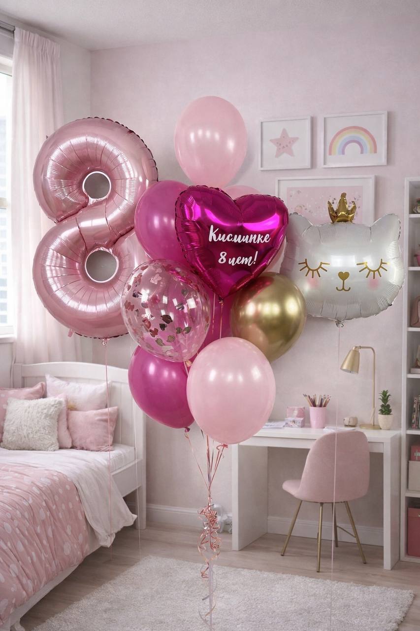 Связка:6 однотонных Шаров, 1 с конфетти, 1 золотой, 1 сердце с надписью. Цифра (на выбор). Фигура кошечки