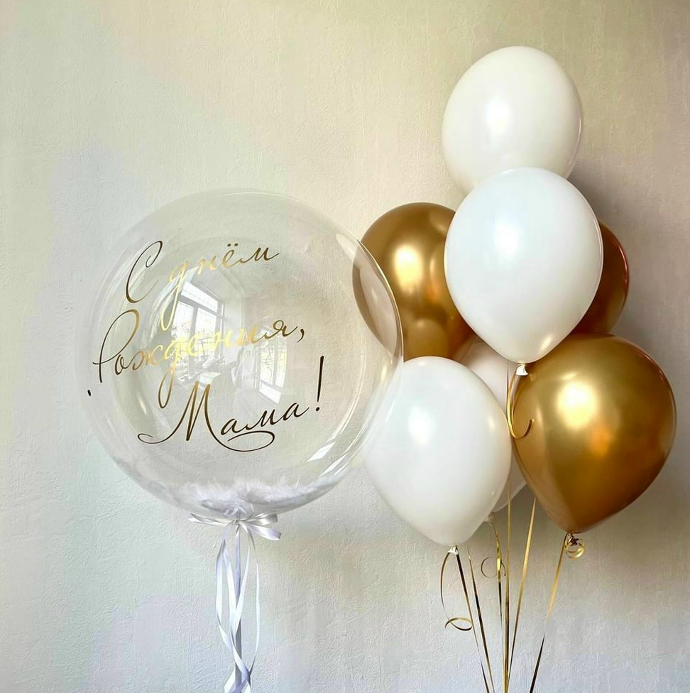 связка: 4 белых шара, 3 золотых шара баблс шар с перьями и надписью